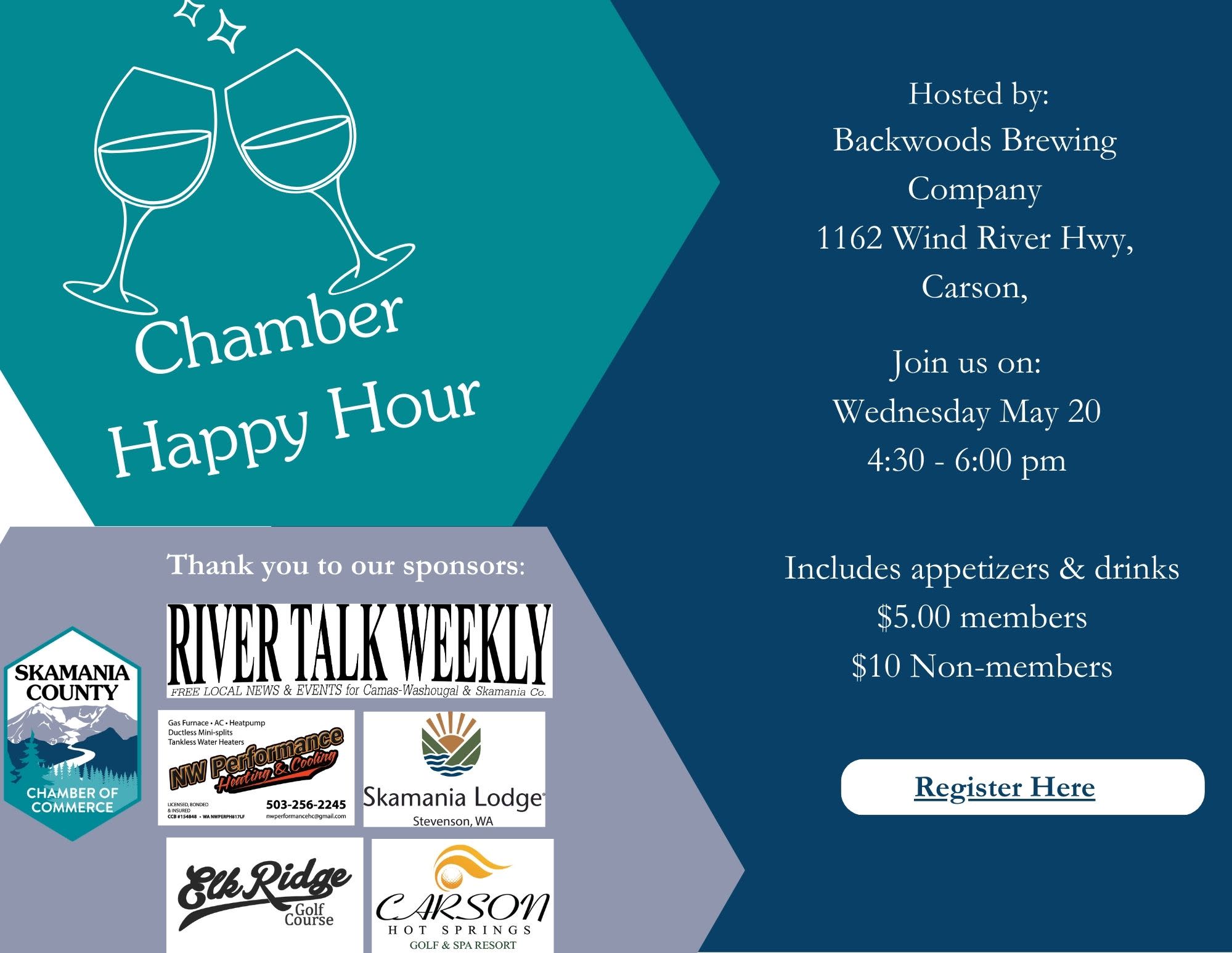 Join us for Chamber Happy Hour on Wednesday 4:30 to 6:00 PM. Connect with fellow business owners, professionals, and community members while enjoying appetizers and drinks. Members: $5 | Non-members: $10 Register today.Images