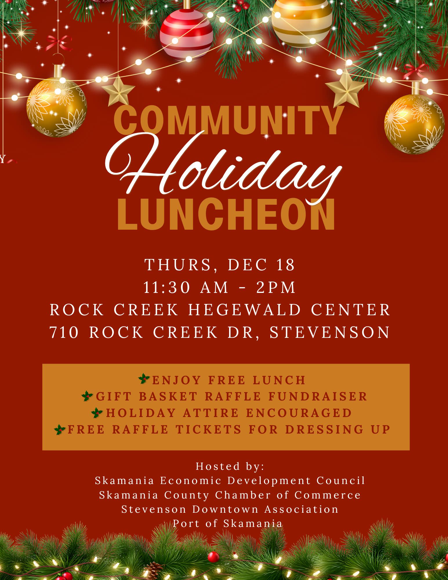 Everyone Is Invited! Join us on for a festive community gathering at the Rock Creek Hegewald Center. Enjoy a free lunch, take part in the gift basket raffle fundraiser, and have fun showing off your holiday attire—guests who dress up will receive free raffle tickets at the door. This cheerful afternoon is co-hosted by the Skamania Economic Development Council, Skamania County Chamber of Commerce, Stevenson Downtown Association, and Port of Skamania.Images